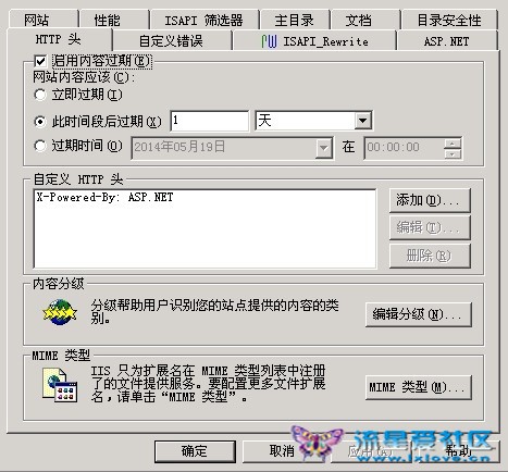 在IIS中定位到網站存放圖片的文件夾,然后打開屬性窗口,在HTTP Headers中做出如下選擇,要求組件的過期時間為本次請求后1天,也就是在本地緩存86400秒。