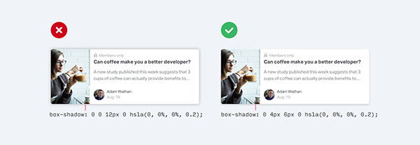 與大面積擴散模糊陰影相比,使用微妙的垂直偏移陰影效果更明顯,更自然,它模擬了最常見的光源特征,光線從上往下照下來從而營造陰影效果,如果你對此有興趣,Material Design Guideline非常清晰講述了這樣陰影的制作細節。