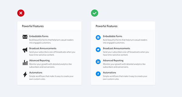 當設計著陸頁時,可能會突出產品的功能,這時你需要一些大圖標來作為視覺錨點,Font Awesome或Zondicons 這樣的網站能幫你找到免費的矢量圖標,然后放大到符合你需求的尺寸。由于他們是矢量圖片,放大無損,但是通常16×16 的圖標放大三四倍,雖然無損,但在視覺上就顯得不專注:缺乏細節,總感覺過于矮胖。可是,如果這些小圖標是你唯一能夠搞得到的素材的話,那么不妨試著將它置于另外一個帶有顏色的圖形當中: