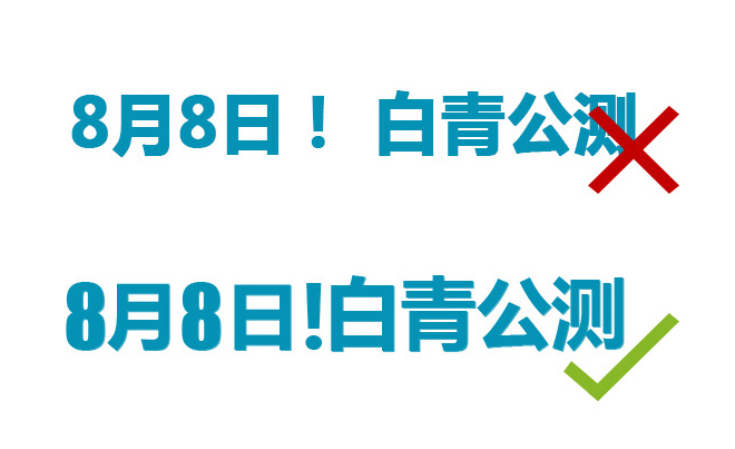 上圖打叉的是我們經常忽略的小細節,用系統默認字體的大小打完專題,你會發現其實中文和英文的大小是不一樣的,上圖數字“8”相比較“月”和“日”明顯略小,這樣,標題會有種上下起伏的感覺,不穩當,第二個是字的間距,默認打完嘆號離文字過遠,直接斷開了2句話,有必要去調整下字的間距,調整后字號也變得更大空間得到合理運用!