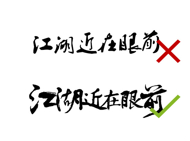 錯誤的示意里我們選用了一款常用的書法字體,當然結果是不理想的,也許項目會反饋你不夠大氣,無論在筆觸上,字形上都不是一個很好的選擇,但是現有的字體無法滿足你的要求,怎么辦,你可以利用一些在線書法生成一些毛筆字,但是要注意的是生成的很多字在筆觸粗細上都不一樣,很容易讓你幾個字放在一起看著很別捏,如果你沒有很好的書法基礎,你需要多下載一些書法筆觸,找出一些字特點并移植到你選中的另外幾個字上,在適當的地方加粗筆觸,這也是一個慢慢磨的過程,但是能提高不少作品的品質感!