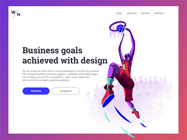 例如:下面的插畫是基于關鍵詞“目標”來進行設計的?;@球運動員灌籃的這一動作和“抵達目標”在寓意上是完美契合的,因此,結合豐富的色彩,通過控制插畫的角度和角色形體,營造出力量感和動感。