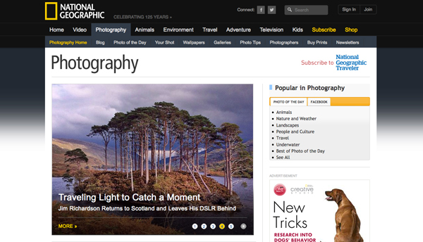 如果一張漂亮的圖片對你的項目有幫助,別僅限于從中汲取靈感,直接使用它。大膽設計,聚焦于這張漂亮圖片。另一方面,如果你沒有合適的圖片,搜羅全世界的照片來尋找靈感。當你感到艱難、設計卡住時,National Geographic、Jill Greenberg和Levon Biss,就是尋求幫助的絕佳地方(而且這些網站圍繞圖片的設計都做得不錯)一張焦點圖一張圖片。