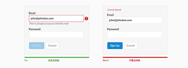指定錯誤內聯,告知用戶發生錯誤的位置及原因。對于位置,就是要明確的告知用戶具體是那個地方出現的錯誤,而并非是簡單的告知用戶有錯誤;對于錯誤,不但要告知用戶錯誤的原因,還要告訴其相應的解決辦法,引導用戶做出正確的操作。