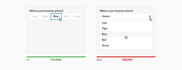 當表單中需要選取不同選項時,低于6個選項就就不需要使用下拉選項來選取了,因為下拉選項是需要兩次點擊完成結果的選擇,而直接選擇來的更快。另外,若超過25個選項,則不能僅僅使用下拉菜單選擇器,還要在下拉列表中結合上下文進行搜索。