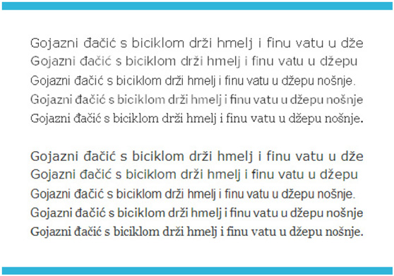 另外一個重要的易讀性測試是為了區分簡單字體字形之間的區別。設計師使用全字母短句,或測試短語來評估和對比字體。比如有名的短語“The quick brown fox jumps over the lazy dog”、“Handgloves”、“Hamburgefonstiv”。