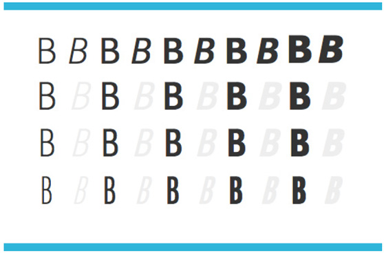 JAF Bernino Sans 有不同的粗細度和寬度。淡化的字母并非真正的斜體,被稱為斜羅馬字體。有的瀏覽器在用CSS快速寫入時能夠使字體變斜。但偽斜體很多時候都被看作違反排版規則的字體。