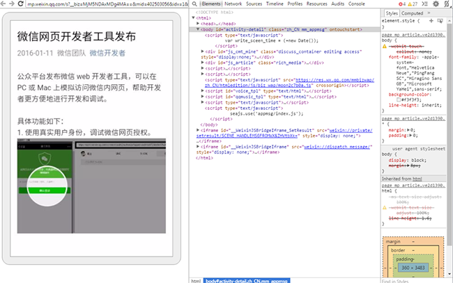 為此,微信 web 開發(fā)者工具同步推出0.5.0版本,繼支持測試號、企業(yè)號、第三方平臺開發(fā)者的使用之后,新增支持實(shí)時(shí)映射手機(jī)屏幕到 PC 或者 Mac 上,可以遠(yuǎn)程調(diào)試 X5 Blink 內(nèi)核上的網(wǎng)頁。