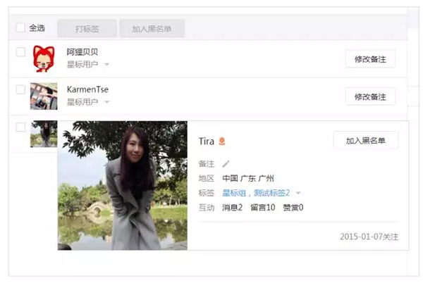本期新增消息數、留言數和贊賞數等互動數據,且顯示用戶關注時間和支持查看用戶頭像大圖,有利于拉近運營者與用戶的距離。