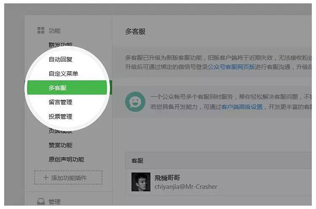 在7月1日后仍未手動升級的舊版多客服的用戶,公眾平臺將自動為其升級到新版網(wǎng)頁功能,舊版多客服將失效。自動升級的用戶,需要登錄微信公眾平臺,在“功能 - 客服功能”頁面中,為客服帳號綁定對應(yīng)的客服人員微信號,綁定后才可使用網(wǎng)頁版客服功能進(jìn)行客服服務(wù)。