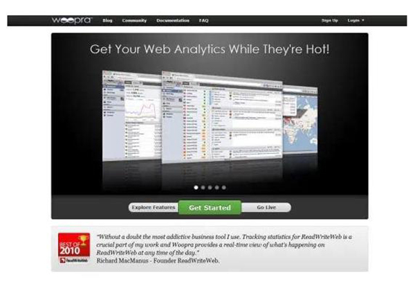 Woopra的出現將實時統計帶到了另一個層次,它能實時直播網站的訪問數據,你甚至可以使用Woopra Chat部件與用戶聊天。不僅如此,另外,Woopra還擁有先進的通知功能,可讓你建立各類通知,如:電子郵件、聲音、彈出框等。
