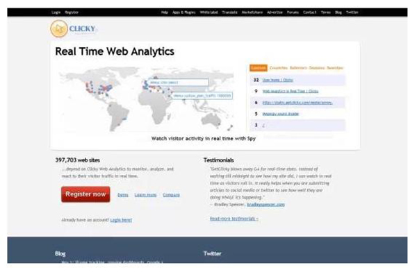 Google Analytics是一個使用非常廣泛的訪問統計工具,目前它推出了一系列的新的功能,可以提供實時報告。你可以看到你的網站中目前在線的訪客數量,了解他們觀看了哪些網頁、他們通過哪個網站鏈接到你的網站、來自哪個國家......。