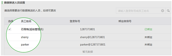 2. 選擇需要接收數(shù)據(jù)推送的操作員(說明:接收數(shù)據(jù)推送需要先登記操作員的微信號)